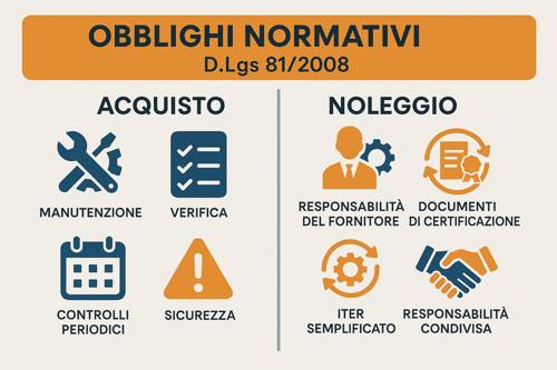 Se l’analisi fiscale è una questione di numeri, quella operativa è una questione di responsabilità. Il Decreto Legislativo 81/2008, noto come Testo Unico sulla Sicurezza sul Lavoro, definisce un quadro di obblighi estremamente rigoroso per garantire che le attrezzature utilizzate nei cantieri siano sicure ed efficienti. Anche in questo caso, gli oneri per chi acquista e per chi noleggia sono profondamente diversi.